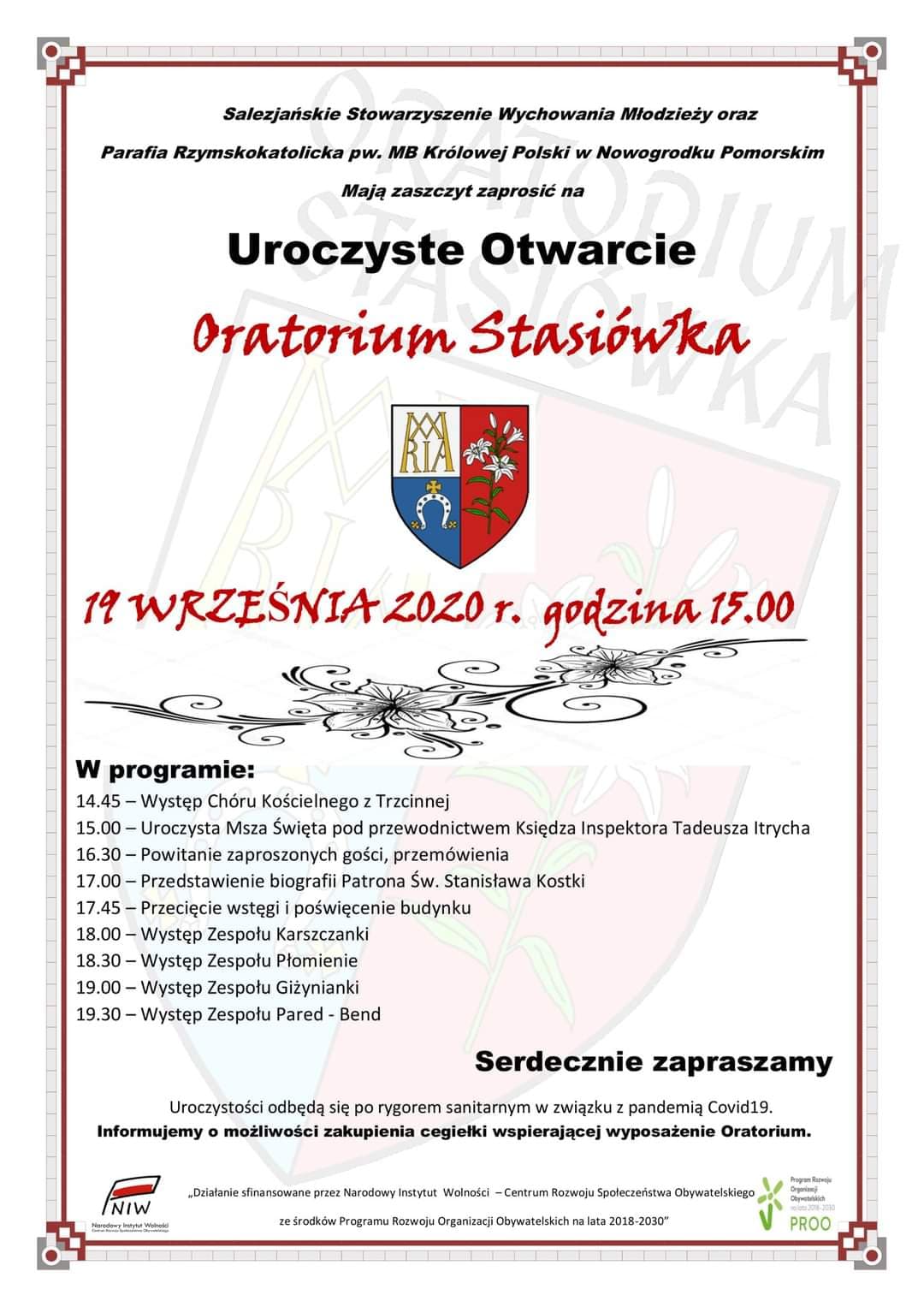 Jest nam niezmiernie miło poinformować, że we współpracy z Fundacją na Rzecz Aktywnego Rozwoju Telemedycyny i e-Zdrowia w Polsce – Fundacja „e-Medycyna” będziemy promować zachowania prozdrowotne i wykonywać badania EKG podczas otwarcia Oratorium Stasiówka. Uroczyste otwarcie odbędzie się już 19 września 2020r. (w sobotę), start od godziny 14:45 w Nowogródku Pomorskim. Szczegółowy plan umieszczamy poniżej. Podczas wydarzenia uczestnicy będą mogli skorzystać z następujących badań (bezpłatnie):